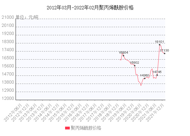 聚丙烯酰胺價格走勢圖,聚丙烯酰胺價格是根據其型號、指標而定的,按照離子型分為:陽離子、陰離子、非離子,三者對比價格陰離子比較便宜陽離子相對較貴。